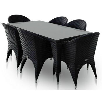 Материалы изделий: каркас - сталь с порошковым покрытием, оплётка каркаса - искусственный ротанг, подушки - водонепроницаемый полиэстер с мягким наполнителем, столешница - ударопрочное закалённое стекло (6 мм).