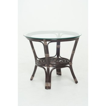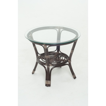 Каркас - натуральный ротанг, подушка - ткань с мягким наполнителем, столешница - стекло.