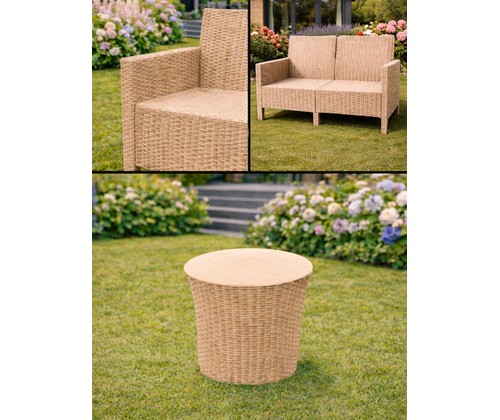 Стильный и практичный комплект из двух кресел, двухместного дивана и кофейного столика с эффектным плетением под ротанг, созданный для комфортного отдыха в саду, на террасе или у бассейна.