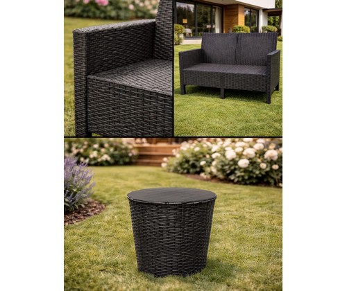 Стильный и практичный комплект из двух кресел, двухместного дивана и кофейного столика с эффектным плетением под ротанг, созданный для комфортного отдыха в саду, на террасе или у бассейна.