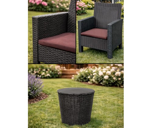 Стильный и практичный комплект из двух кресел и кофейного столика с эффектным плетением под ротанг, созданный для комфортного отдыха в саду, на террасе или у бассейна.