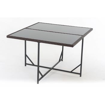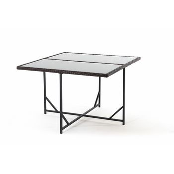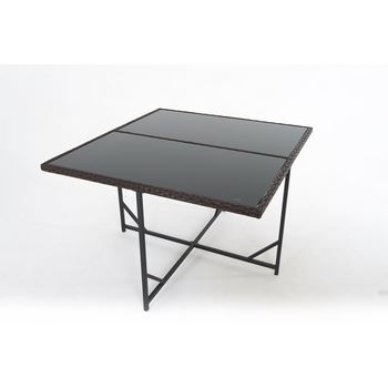 Материал изделия: Каркас - сталь, плетение - искусственный ротанг (полипропилен), подушки - ткань полиэстер с поролоновым наполнителем, столешница - стекло.