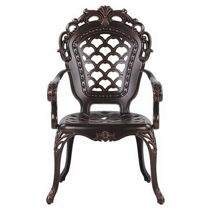 Обеденный комплект из литого алюминия состоит из стола и четырех кресел с подлокотниками.