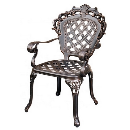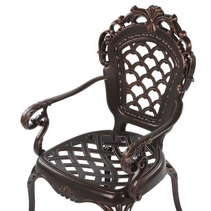 Обеденный комплект из литого алюминия состоит из стола и четырех кресел с подлокотниками.