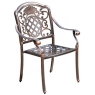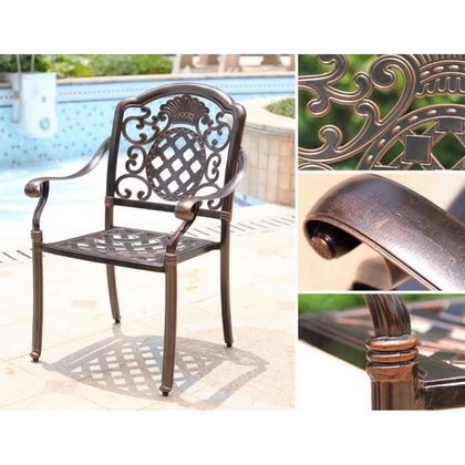 Обеденный комплект из литого алюминия состоит из стола и четырех кресел с подлокотниками.
