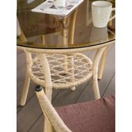 Стол со стеклянной столешницей визуально облегчает композицию и позволяет любоваться красивым плетением основания.