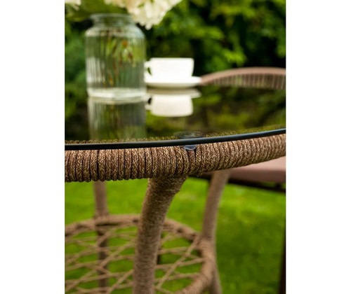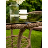 Стол со стеклянной столешницей визуально облегчает композицию и позволяет любоваться красивым плетением основания.