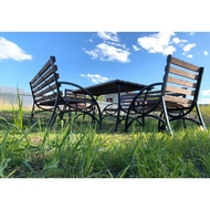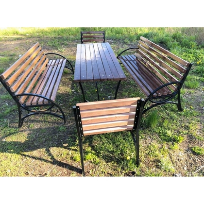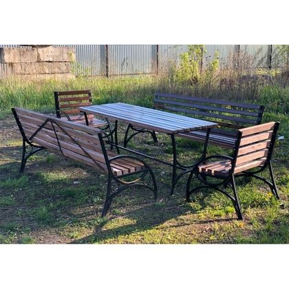 Скамейка и кресло: каркас - сталь с порошковым покрытием RAL 9005, сиденье - сосна, ель.
