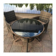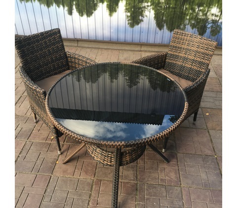 Комплект состоит из круглого стола и 2 кресел с подушками.