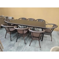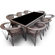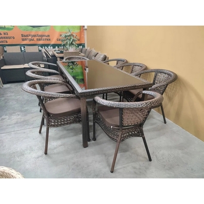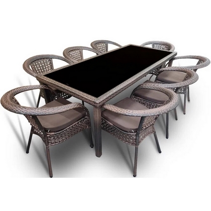 Комплект мебели из искусственного ротанга состоит из прямоугольного стола и 8 кресел.