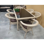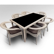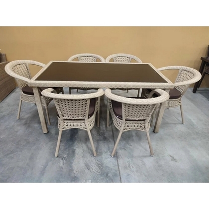 Комплект мебели из искусственного ротанга состоит из прямоугольного стола и 6 кресел.