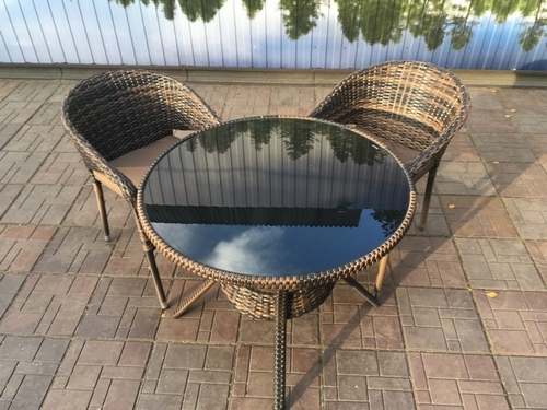 комплект состоит из стола с круглой столешницей и двух кресел с подушками,