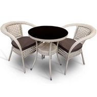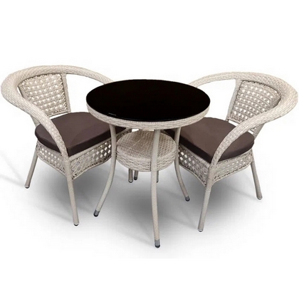Комплект мебели из искусственного ротанга состоит из круглого стола и 2-ух кресел.