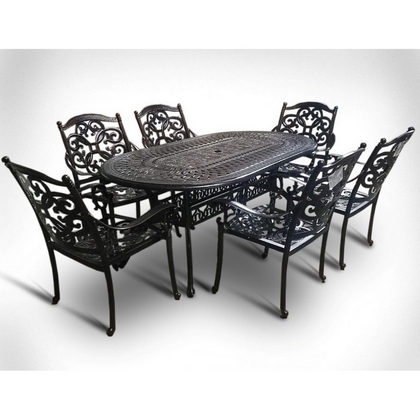 Комплект мебели из литого алюминия состоит из овального стола Брайдед и 6 кресел Джунген.