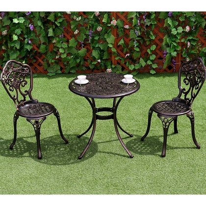 Комплект мебели из литого алюминия состоит из стола и двух стульев.