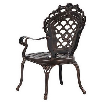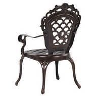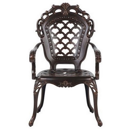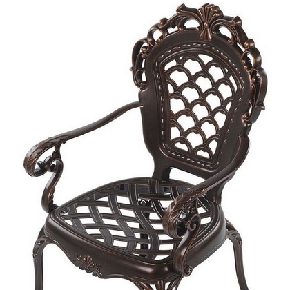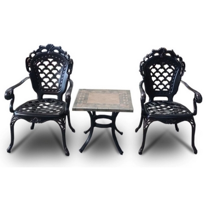 Комплект из литого алюминия состоит из квадратного столика и двух кресел с подлокотниками.