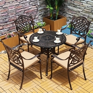 Комплект мебели из литого алюминия состоит из стола и четырех кресел с подлокотниками.