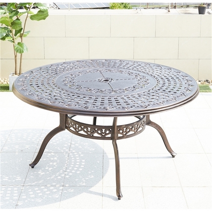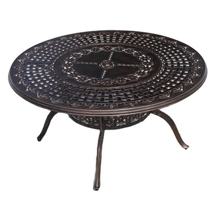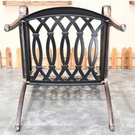 Комплект мебели из литого алюминия состоит из круглого стола и шести кресел с подлокотниками.