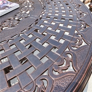 Комплект мебели из литого алюминия состоит из круглого стола и восьми кресел с подлокотниками.