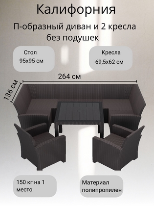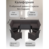 Комплект мебели под ротанг Калифорния (California) с П-образным диваном 136х264х136 см 6 мест, 2 креслами, без подушек, со столом 95х95 см