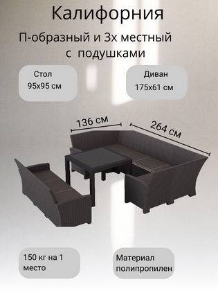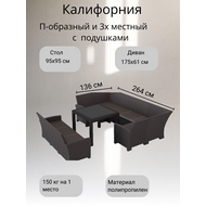 Комплект мебели под ротанг Калифорния (California) с П-образным диваном 136х264х136 см 6 мест, 3х-местным диваном 175х61 см, с подушками на сиденье и столом 95х95см.