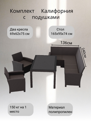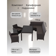 Комплект мебели под ротанг Калифорния (California) с угловым диваном 240х136 см, 2 креслами, с подушками на сиденье и столом 165х95 см.