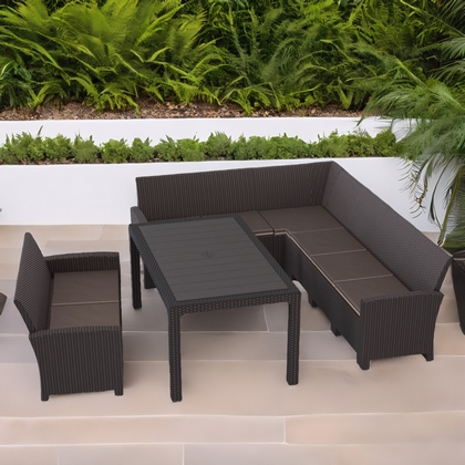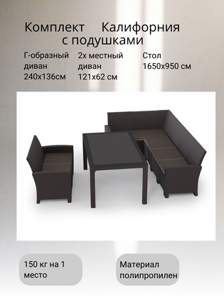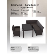 Комплект мебели под ротанг Калифорния (California) с угловым диваном 240х136 см, 2х-местным диваном 121х62 см, с подушками на сиденье и столом 165х95 см.