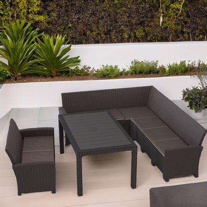 Дизайн пластика под ротанг придает мебели естественный вид и гармонично сочетается с любым ландшафтом.