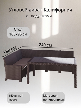 Комплект мебели под ротанг Калифорния (California) с угловым диваном 240х188 см с подушками на сиденье и столом 165х95 см.