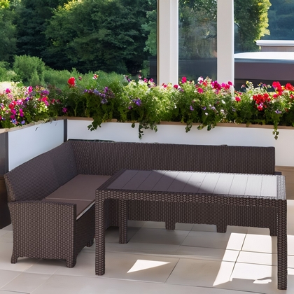 Дизайн пластика под ротанг придает мебели естественный вид и гармонично сочетается с любым ландшафтом.