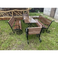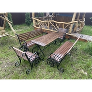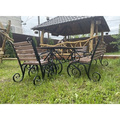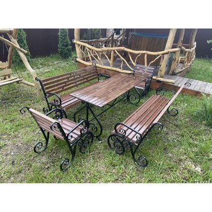 Скамейка и кресло: каркас - металл, покрытие каркаса - порошковая полиэфирная глянцевая краска RAL 9005, сиденье - дерево.