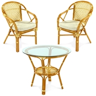 Материалы изделия: каркас - натуральный ротанг, столешница - стекло, подушки - рогожка с мягким наполнителем.