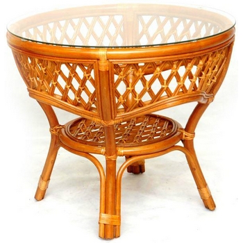 Материалы изделий: каркас - натуральный ротанг, столешница - стекло, подушки - шенилл с мягким наполнителем, оплётка - натуральная кожа.