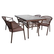 Обеденный комплект включает в себя стол, два стула и трехместный диван с подушками.