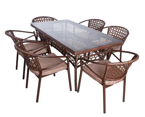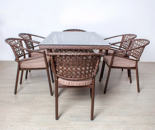 Комплект садовой мебели со столом Адлер длиной 1,6 метра и шестью стульями Латте с подушкой подходит для использования на открытых верандах и террасах.