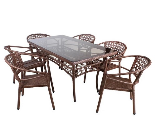 Комплект садовой мебели со столом Адлер длиной 1,6 метра и шестью стульями Латте с ротангом подходит для использования на открытых верандах и террасах.