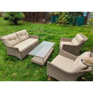 Комплект состоит из двухместного дивана, столика и двух кресел.