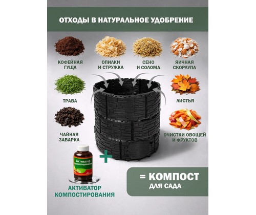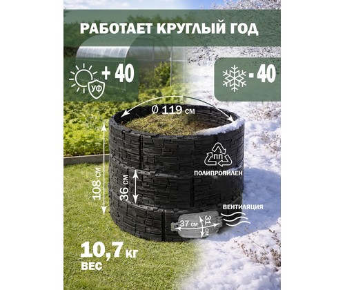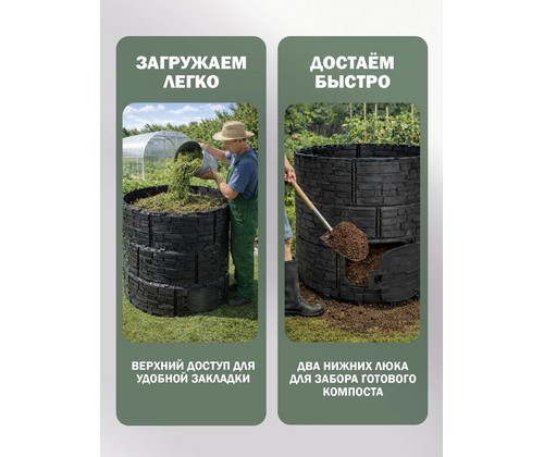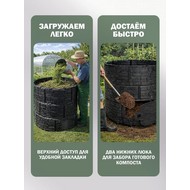 Усиленная конструкция с ребрами жесткости, двумя дверцами-люками и надежной крышкой обеспечивает долговечность, удобство загрузки и извлечения компоста.