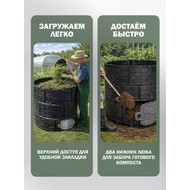 Усиленная конструкция с ребрами жесткости, двумя дверцами-люками и надежной крышкой обеспечивает долговечность, удобство загрузки и извлечения компоста.