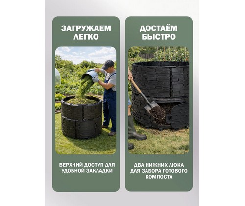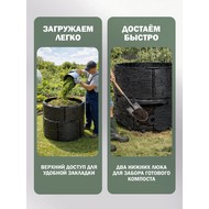 Усиленная конструкция с ребрами жесткости и двумя дверцами-люками обеспечивает долговечность, удобство загрузки и извлечения компоста.
