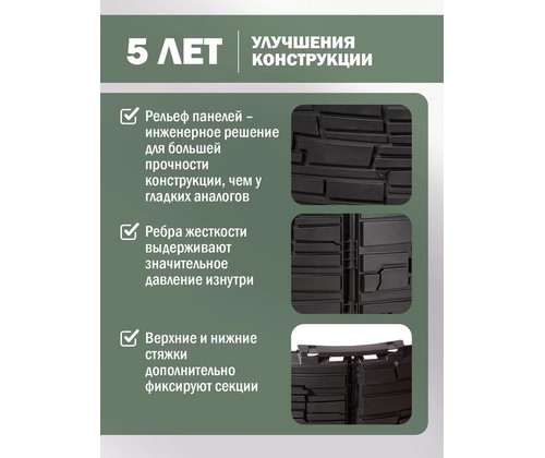 Рельефные панели и ребра жесткости по всей конструкции обеспечивают высокую прочность и устойчивость к нагрузкам от грунта и компостной массы.