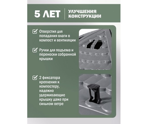 Благодаря системе фиксаторов крышка плотно прилегает к краям компостера.