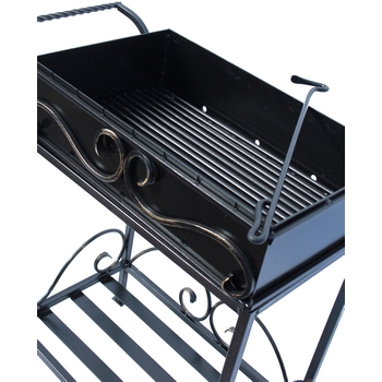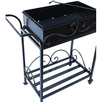 Дополнительная информация: долгий срок службы обеспечивает решетка на дне топки и ребра жесткости, встроенные по периметру мангала. Мангал изготовлен из качественной стали марки СТ-3. В стенках топки имеются отверстия, которые обеспечивают естественный поддув. Ножки изделия оборудованы колесиками, что позволяет легко перемещать мангал в удобное место или убирать его в гараж. Мангал украшают кованные узоры ручной работы. Ребра жесткости и решетка на дне, обеспечат долгую службу мангала.