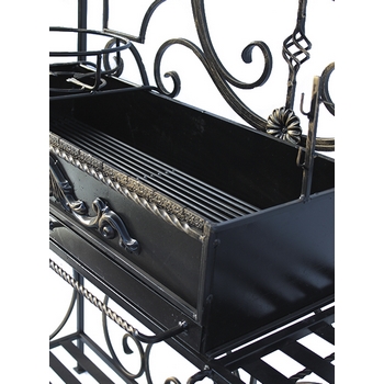 Дополнительная информация: оборудован крышей, можно жарить шашлык в дождь. Долгий срок службы обеспечивает решетка на дне топки и ребра жесткости, встроенные по периметру мангала. Мангал изготовлен из качественной стали марки СТ-3. Топка оснащена прорезями для фиксации шампуров и держателями для вертела. В комплекте с мангалом идет подставка для казана и кочерга. Топка у мангала съемная, поэтому она легко чистится и переносится. Стойки надежные и прочные, имеются места для дров и посуды.
