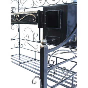 Дополнительная информация: оборудован крышей, можно жарить шашлык в дождь. Долгий срок службы обеспечивает решетка на дне топки и ребра жесткости, встроенные по периметру мангала. Мангал изготовлен из качественной стали марки СТ-3. В стенках топки имеются отверстия, которые обеспечивают естественный поддув. Толщина стенок топки 3 мм, дно 3 мм. Толщина стенок печки для казана 3 мм. Решетка на дне продлевает срок службы топки в несколько раз. Топку можно снять, её легко чистить, перемещать или заменять.