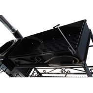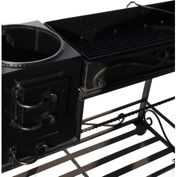 Дополнительная информация: долгий срок службы обеспечивает решетка на дне топки и ребра жесткости, встроенные по периметру мангала. Мангал изготовлен из качественной стали марки СТ-3. В стенках топки имеются отверстия, которые обеспечивают естественный поддув. Данный мангал совмещает в себе и жаровню, и печь. Оригинальные украшения ручной работы. Жаровня съемная - легко чистится и перемещается, просто заменить в случае выхода из строя. Дно топки оборудовано решеткой, периметр топки усилен ребрами жесткости, что защищает от деформации из-за высокой температуры. Стенки печки для казана – 3 мм.