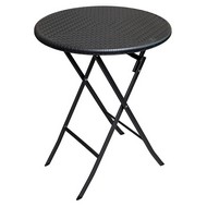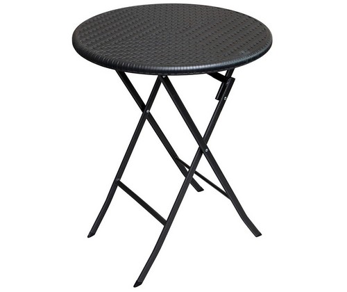 Круглая столешница выполнена из атмосферостойкого пластика тёмного Цветовое исполнениеа с имитацией плетения.