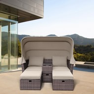 Материалы изделий: металлический каркас оплетён высококачественным искусственным ротангом, подушки с чехлами из водоотталкивающей ткани, тент из водонепроницаемой ткани.