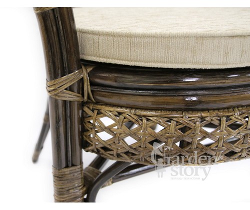 Материалы: каркас - ротанг натуральный, материал чехла мягкого элемента - полиэстер+хлопок, материал поверхности - ротанг натуральный, стекло.