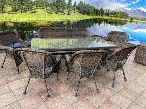 Комплект состоит из стола, 3-местного дивана и пяти кресел.